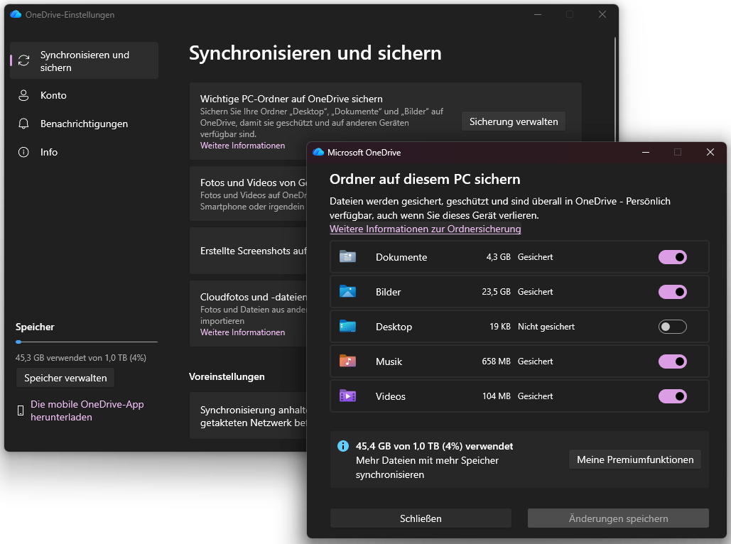 Man braucht nur in den Einstellungen von OneDrive im Bereich Synchronisieren und Sichern auf Sicherung verwalten zu klicken und im nächsten Dialogfeld die Sicherung des Desktop abzuschalten. Office 2003 stürzt dann auf Windows 11 nicht mehr ab.